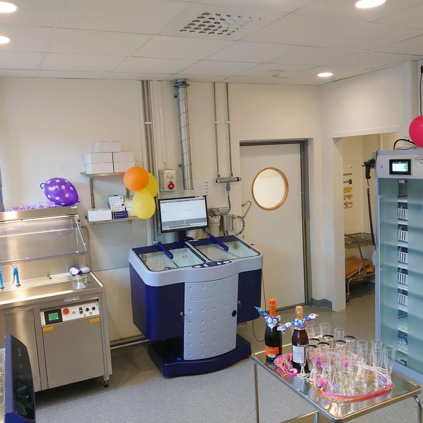 Den nya diskdesinfektorn är en toppmatad Advantage Plus med två asynkrona kammare och automatisk spritning efter tvätt. Maskinen är utrustad med en PC med pekskärm, streckkodsläsare för enkel och snabb användning samt fasta program, vilket gör den mycket lättanvänd.