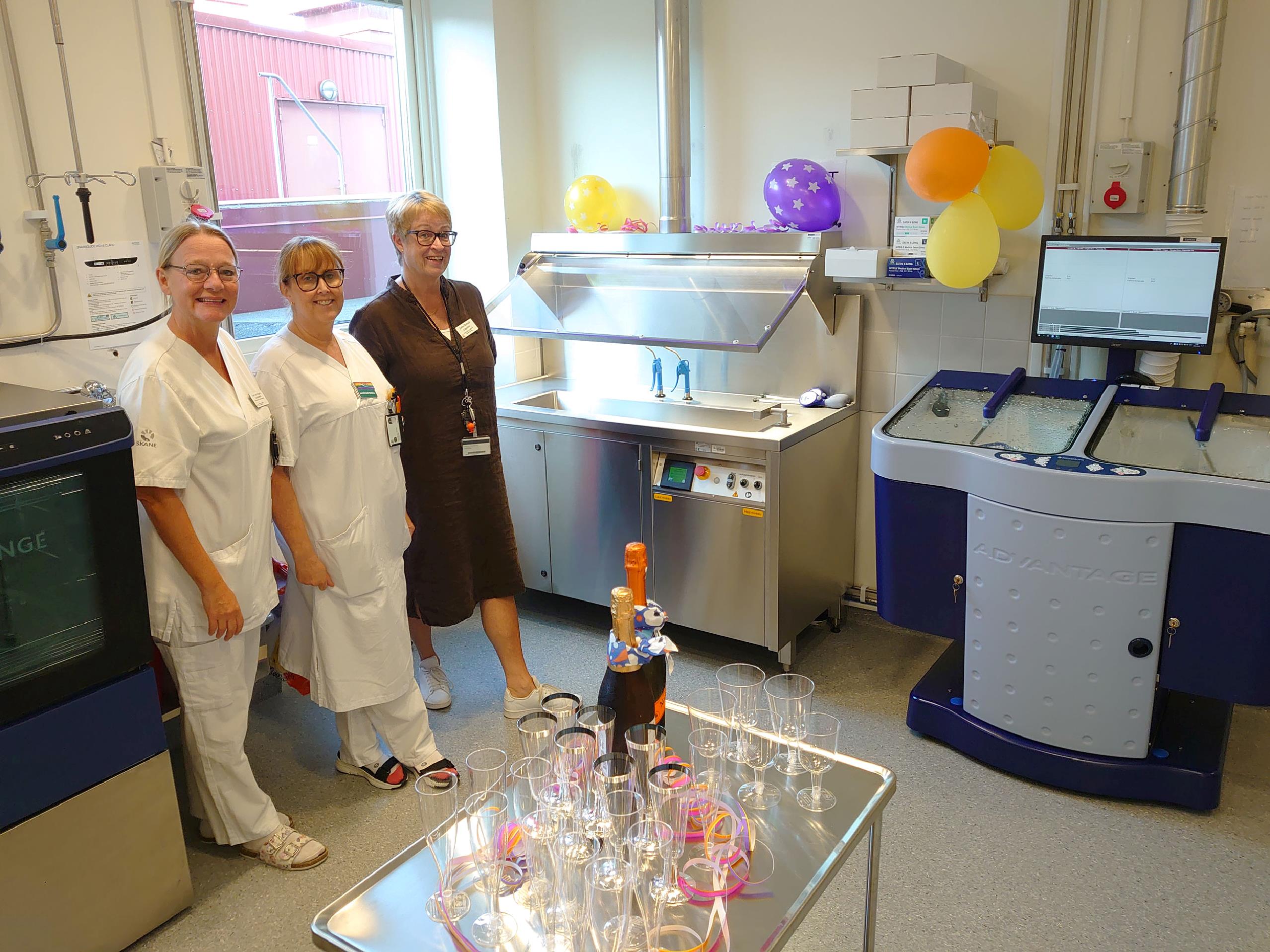 ”Disk- och torkprocessen tar mindre tid, vilket har gjort att fler cystoskopier kan utföras på mottagningen,” säger Enhetschef Anita Ekelund (till höger), som på bilden syns tillsammans med undersköterskorna Lise-Lotte Ringsby och Ullrika Ellkvist.