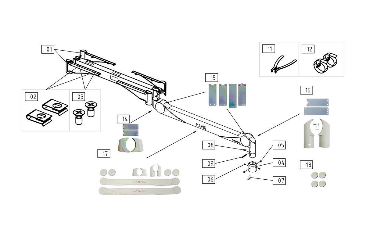 Till Mavig kan man köpa alla reservdelar som finns. Man kan få sprängskisser överarmar och övriga produkter.