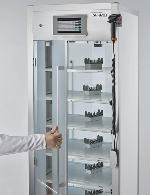 ENDODRYTM-skåpet är ett tork- och förvaringsskåp för upp till 8 endoskop, och endoskopen förvaras i en specialkassett. Samma kassett används också i Advantage ®Plus-diskdesinfektorn och gör att de dyrbara endoskopen kan hanteras på ett enkelt och säkert sätt.