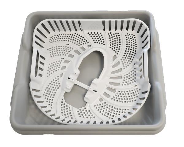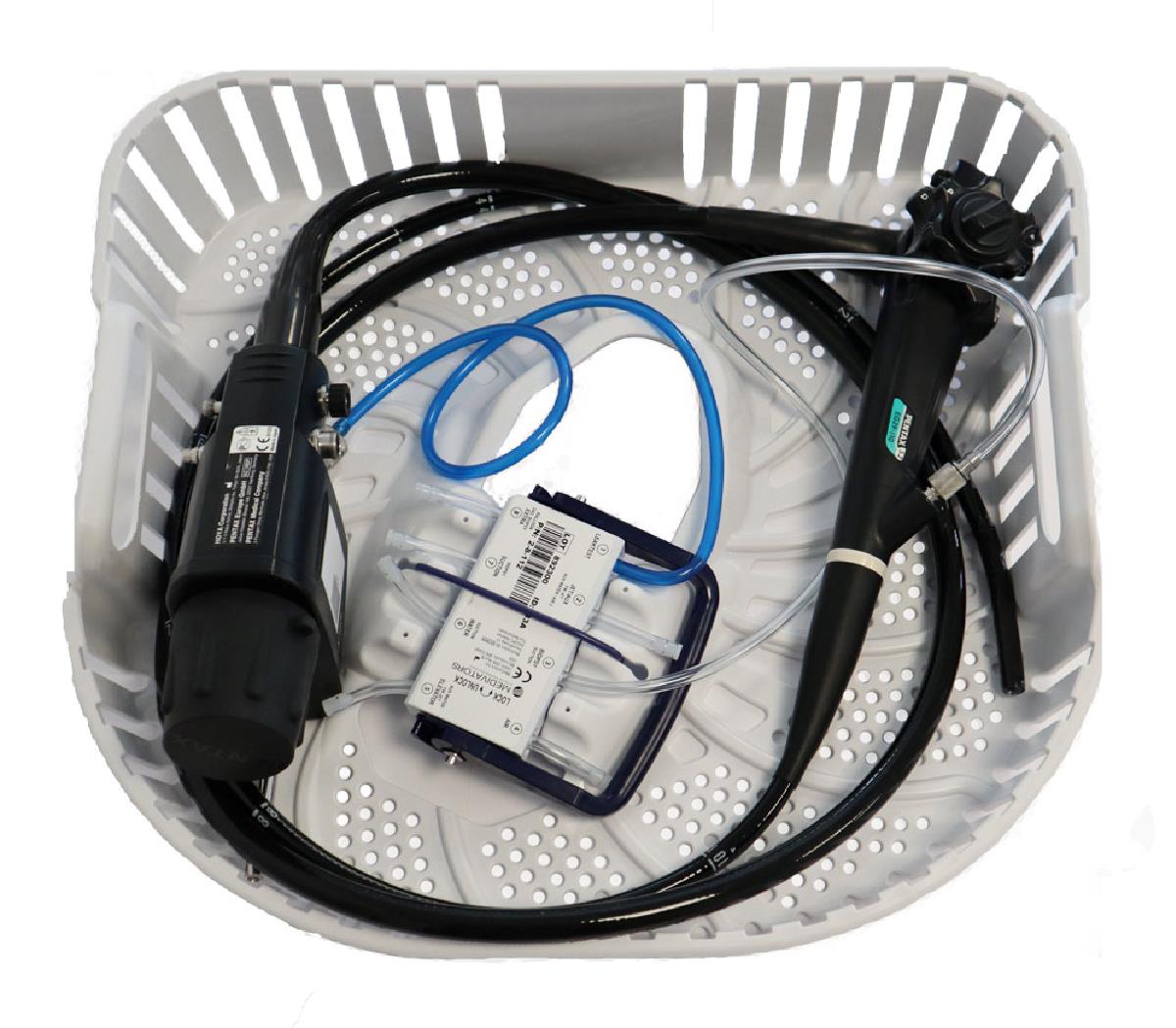 Plastkassetten passar i både tvättmaskiner och torkskåp från Steris. När skopet placerats i kassetten kan det tvättas, desinficeras och torkas utan manuell hantering.