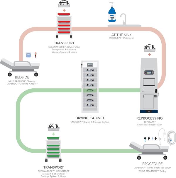 Endoskopet ligger i en och samma kassett under disk, torkning, förvaring och transport.